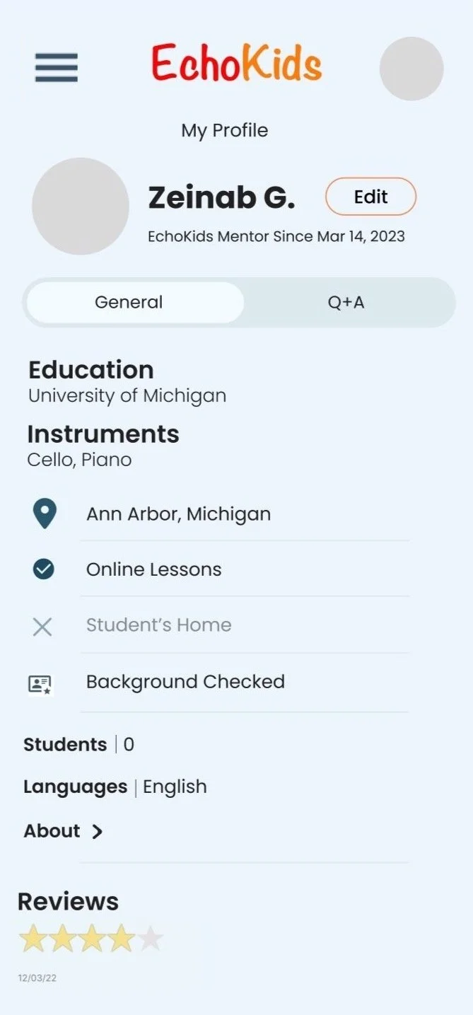 My primary focus was on optimizing the Music Teacher Profile section—a critical component that allows EchoKids instructors to update their profiles while giving parents (customers) an easy way to evaluate teachers before booking lessons.